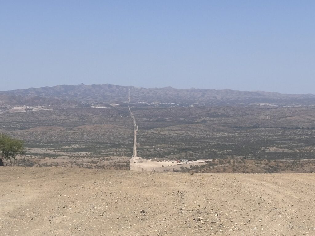 Desde el oeste de las montañas Patagonias, al borde del Valle de San Rafael. Estas obras de construcción impactarán las sierras al borde del valle. Juntas, harán que el muro llegue a unos 150 millas continuas.
