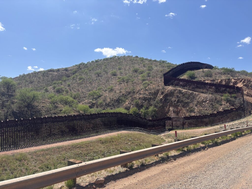 “It was a cool spring day when we toured a conservation ranch in Sonora, just south of the border. A very quiet day, except for the wind and occasional cow. We saw no other people, no other vehicles, in the course of six hours of poking around the ranch. The border was marked by a barbed wire fence to control cattle, and a vehicle barrier. Both seemed to be doing their jobs. Seeing a border monument from its south side, with Spanish text and the Mexican eagle, was a reminder that this is the northern edge of a large country, in addition to being the southern edge of another. And that there was once a cooperative effort to survey and mark that boundary for the benefit of both countries.”